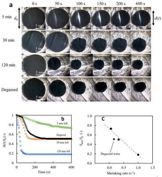 To investigate the kinetics of the volume changes, we monitored the swollen state of the gels before and after LED light irradiation. Figure 6a is a series of photographs of gel disks captured at given time points to investigate the size change behavior of PNIPAM-co-AAc gel disks prepared using bubble water and degassed water under light irradiation (see Videos S1–S4). A comparison of these sequential photographs shows that the leaving time of the bubble water affects the gel shrinking rate. From the series of images, simultaneous comparisons after light irradiation reveal distinct kinetic behaviors of the gels. Specifically, the gel prepared with a standing time of 5 min exhibited the highest extended shrinkage rate. Conversely, the gel prepared with water using a standing time of 120 min showed almost complete shrinkage within 100 s. These observations support the hypothesis that gels prepared with water using different bubble water standing times exhibit markedly different kinetic properties. Figure 6b gives the time course of the change in the hydrogel disk’s relative area (area at t = 0 is 1). The gel disk first undergoes a slow shrinkage step, which is then replaced by a rapid shrinkage step, resulting in a metastable stable state (as seen in the typical behavior of gels prepared with degassed water). Upon reaching this metastable state, a significant slowdown in area shrinkage was observed. In other words, the gel undergoes a two-step dynamic to reach the equilibrium swelling value in shrinkage. Most samples reached this metastable state within 600 min after LED irradiation, although as shown in Section 2.2.4. all gels can reach the equilibrium shrinkage state (S∞/S0 = 0.12, where the equilibrium gel disk area is in the shrunken and swollen states, respectively) at around 30 °C when the temperature increases over time. The metastable state swelling ratio S600/S0 is larger than all samples’ equilibrium swelling ratio in the shrunken state (S∞/S0 = 0.12). This means that true equilibrium was not reached by 600 min. The significant slowdown in the metastable state is due to the dense network that forms from the gel surface during shrinkage, and the friction between the water and the polymer network causes a significant delay in the internal water ejection rate [60,61,62]. This figure shows that the water used for gel preparation makes a clear difference in the metastable state swelling ratio (S600/S0) and the shrinking rate (d(S(t)/S0)/dt), which corresponds to the slope of each curve. These values represent the gel disk area at 600 and t seconds after the light irradiation, respectively. Gels prepared with bubble water showed a lower metastable state swelling ratio and a faster rate as time increased. In contrast, hydrogels prepared with 120 min of settled bubble water exhibited the most shrunken metastable state with a significantly accelerated shrinking rate. Notably, as shown in Figure 6c, we can see a linear relationship between the fastest transition rate to this metastable state and the swelling ratio in the metastable state (S600/S0) in the metastable state for gels with bubble gel.