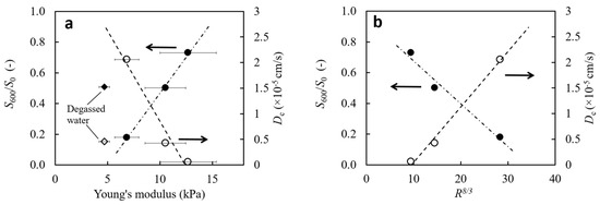 The relationship between the obtained cooperative diffusion coefficient and Young’s modulus of the gel and the swelling ratio in the metastable state is shown in Figure 7a. An almost linear relationship between Young’s modulus and the quasi-equilibrium swelling ratio and diffusion coefficient is observed for gels prepared with bubble water. This linear relationship implies that the gel structure, influenced by the presence of bubbles, affects the transition behavior in this region. Young’s modulus of the network is also essentially related to the density of cross-linking points. This linearity also tells us that nano-bubble water can affect the density or distribution of the network formed. The fact that the gel properties of gels prepared with degassed water deviate from this linear relationship suggests that the topology of the vacancies used as water channels for dehydration may differ fundamentally from those prepared with bubble water.