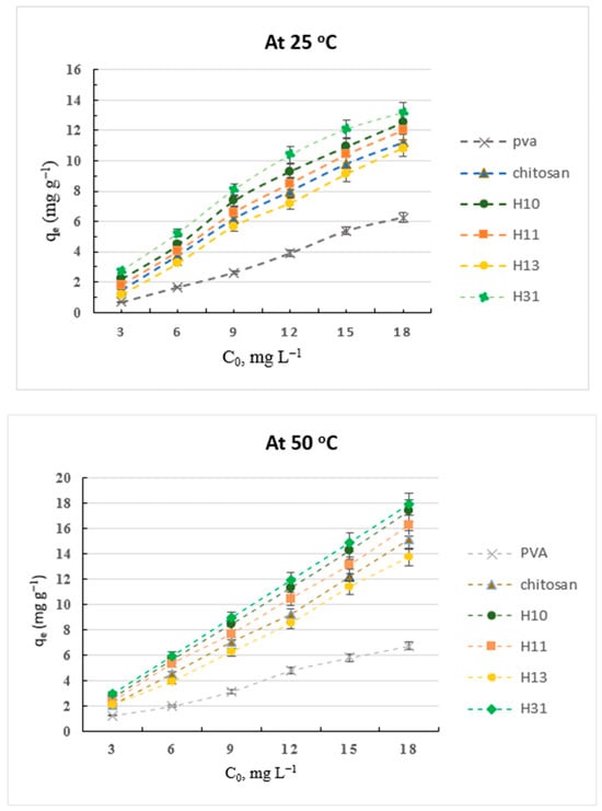 The results of the adsorption capacity (qe, Equation (1)) for different CR dye concentrations, at 25 and 50 °C, and at pH 7, for the prepared hydrogels and the H31/AgNP composites are shown in Figure 1 and Figure 2, respectively.