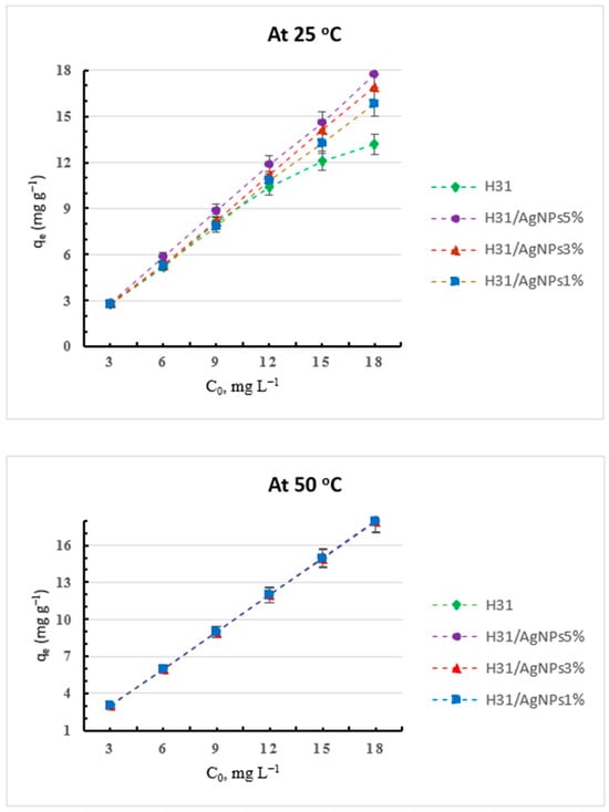 The results of the capacity (qe, Equation (1)) for adsorption of the CV dye onto the prepared hydrogels and the H31/AgNP composites at different dye concentrations, at 25 and 50 °C, and at pH 7 are shown in Figure 3 and Figure 4, respectively.