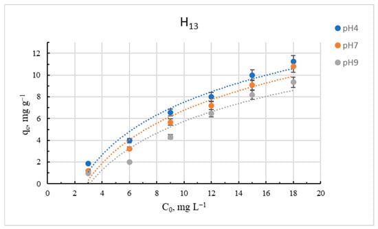 The capacity of CR dye to adsorb onto H13 at different dye concentrations, at different pHs, and at 25 °C.