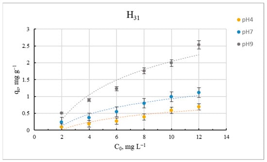 The capacity of CV dye to adsorb onto H31 at different dye concentrations, at different pHs, and at 25 °C.