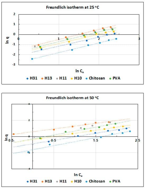 The values of 1/n and were obtained by plotting ln against ln as the slope and the intercept, respectively. Briefly, 1/n (the intensity of the adsorption) predicts any phenomenon that happens along the process of adsorption; 1/n < 1 means normal adsorption; 1/n > 1 means cooperative adsorption; and 1/n being near to zero means that the adsorbent surface is more heterogeneous [].