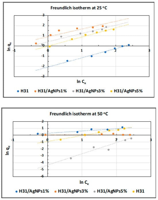 Freundlich isotherm of CV dye adsorption onto the H31 and the H31/AgNP composites.