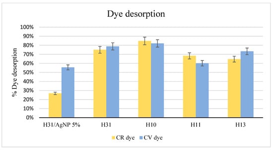 The desorption of the CR and the CV dyes was calculated using Equation (14). Methanol, as a desorption medium, showed that the desorption percentage reached 75 and 79% for the adsorption of CR and CV dyes onto H31, respectively, and reached 65 and 73% for the adsorption of CR and CV onto H13, respectively (Figure 11). These outcomes proved that the hydrogels could be effectively reused to adsorb both the CR and the CV dyes from their aqueous solutions.