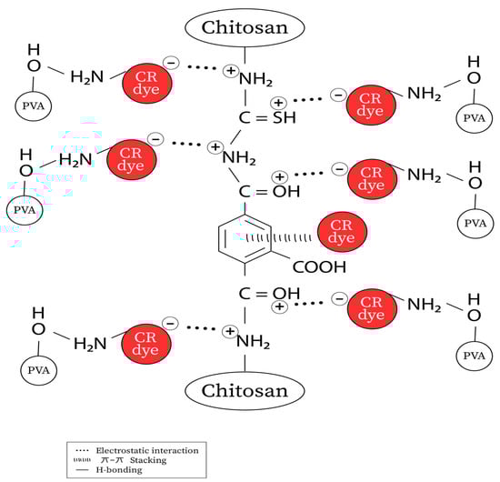 Poly(vinyl alcohol), PVA, an eco-friendly synthetic vinyl polymer, showed some unique physicochemical and mechanical features such as flexibility, water solubility, hydrophilicity, chemical stability, high tensile strength, inherent non-toxicity, non-carcinogenicity, bio-compatibility, bio-degradability, elasticity, and film and gel forming ability []. It has numerous biomedical, industrial and environmental applications since it is used as a basic material for replacing skin and the cartilage, vocal cord reconstruction, and contact lenses and as a better adsorbent of cationic dyes than anionic ones [,]. Thus, the enhancement of its adsorption capability toward anionic dyes is considered to be a desired approach for extending its application fields. Hence, its incorporation with another polymer with a high adsorption capacity for anionic dyes, such as chitosan, is deemed a key to the enhancement of its adsorption capability for anionic dyes.