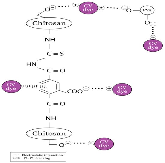 The proposed adsorption mechanism for CV dye of the prepared hydrogels at pH 9.