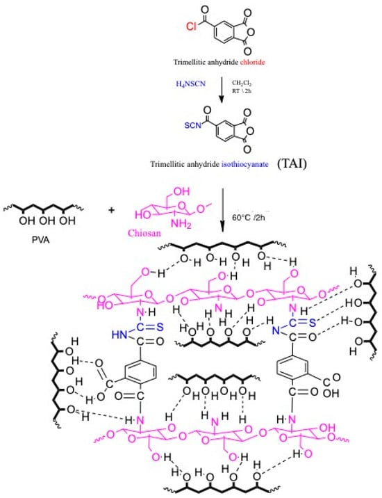 Following the procedure reported in our previous work [], firstly, a prespecified molar quantity of solid trimellitic anhydride chloride was gradually added to an equimolar quantity of NH4SCN that was dissolved in 25 mL of CH2Cl2, followed by the addition of polyethylene glycol-400 (1 mL), a phase transfer agent, stirring this well at 25 °C for 120 min. The reaction mixture was filtered to isolate the white precipitate (the by-product, NH4Cl) and obtain the trimellitic anhydride isothiocyanate cross-linker (TAI, Scheme 3) as a filtrate []. Secondly, a chitosan solution (1.5% wt/v using aqueous acetic acid (1% v/v) as a solvent) was blended with a PVA solution (5.0% wt/v, in distilled water at 60 °C), stirring this well at 60 °C for 60 min. TAI was slowly added to the resulting chitosan/PVA blend solutions with various weight ratios (Table 8), stirring this well at 60 °C for 120 min, and then at room temperature overnight. The molar ratio of TAI to the chitosan component in the blend was 1:2, respectively (Table 8 and Scheme 3). The acetic acid was eliminated from the resulting hydrogels via a neutralizing reaction using a NaHCO3 solution, then soaked in methanol for dewatering and desalting, filtration, and finally drying at 60 °C. The obtained hydrogels showed a color ranging from faint yellow to dark yellow in accordance with the TAI content that was based on the content of chitosan in the hydrogel. The ratios of the reactants are summarized in Table 8, with the production of four hydrogels symbolized as H10, H11, H13, and H31 [].