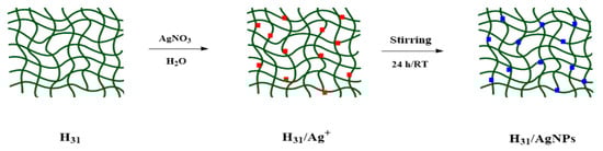 Three different predetermined quantities of AgNO3 were separately dissolved in 10 mL of deionized H2O. Each AgNO3 solution was stirred with a constant weight of H31 (1 g) that priorly swelled in 50 mL of trisodium citrate solution (0.01 mol L−1) at room temperature for 24 h. A perceivable color variation in the three producing composites was detected that ranged from light to dark brown in proportion to the increase in the AgNO3 concentration. This indicated that the Ag+ cations were reduced to AgNPs inside the H31 matrix (Scheme 4). The composites were filtered, rinsed repeatedly with water then methanol, and dried at 60 °C. The used concentrations of silver nitrate were 1 wt%, 3 wt%, and 5 wt% in accordance with the weight of H31, producing three composites symbolized as H31/AgNPs1%, H31/AgNPs3%, and H31/AgNPs5%, respectively [].