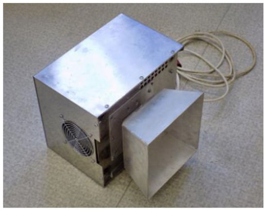 Almost every household has a microwave oven nowadays, and the concept of microwave heating is also used in many other sectors outside the food industry. For example, it is widely used in medicine, the aforementioned food industry, the military or aviation industry, as well as in the construction industry. Numerous studies have already been carried out in the field of construction, which have confirmed the possibility of using microwaves for drying construction materials [,,,,]. The assembly used for irradiation consists of an energy source, an energy generator, a horn antenna, and a microwave intensity indicator, as shown in Figure 2 [].