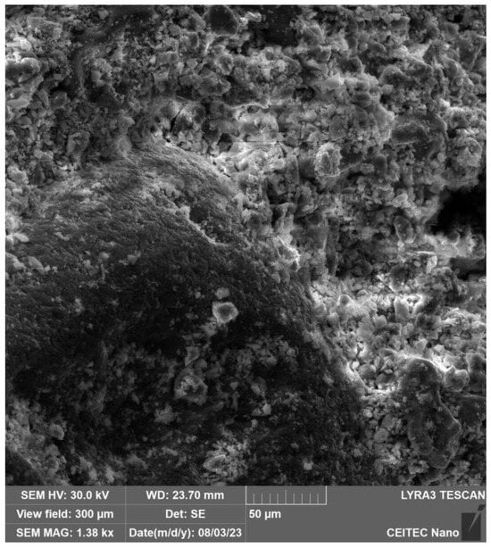 The flexural tensile strength was determined on 40 × 40 × 160 mm beams placed symmetrically on the supports and uniformly loaded with a hydraulic press perpendicular to the compaction direction. The flexural strength value was calculated as the average of the three determined values. The test procedure and the evaluation were carried out in accordance with the relevant standard ČSN EN 12390-5 [].
