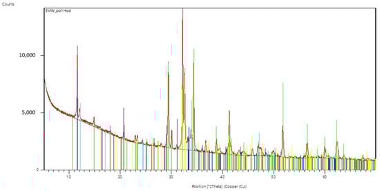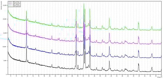 X-ray analysis indicated that the samples contain the same minerals in approximately equal proportions. In general, it cannot be said that microwave exposure has an effect on the representation of individual clinker minerals during hydration of the C-S-H gel. The display of the specimens can be seen in Figure 3 and Figure 4 and Section 4.2, where the gradual hardening of the concrete can be observed. It can be noticed that the concrete exposed to microwave radiation has a lower moisture content and the cement has hydrated faster.