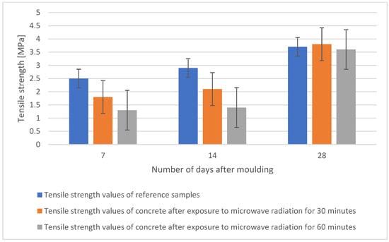 The resulting mechanical properties were determined by destructive strength tests. The tensile strengths of the specimens exposed to microwave radiation and the reference specimens were found to be comparable. Therefore, the main difference in the mechanical properties is mainly in the compressive strength. The experiments show that the resulting compressive strengths of the reference specimens are higher than those of the specimens exposed to microwave radiation, and at the same time a trend can be observed whereby the resulting compressive strength of the concrete decreases as the time of exposure to microwave radiation increases. The results suggest that the cause of this difference can be found in the higher temperature to which the concrete was exposed. The values of bulk density and absorption can be considered comparable for all samples and, in general, the resulting effect of microwave exposure on these properties of the samples cannot be clearly specified.