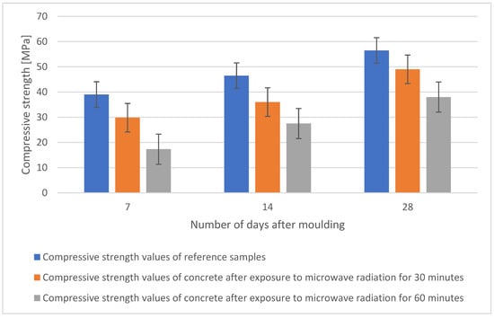 The compressive strength test was carried out according to ČSN EN 12390-5 on 40 × 40 × 160 mm beam fragments and was completed after the tensile strength test. The test specimens were stored in a water bath prior to the test and then dried in an oven at 105 °C. The compressive strength of each specimen over time for all concretes is shown in Figure 11. The results show that the reference specimen has the highest compressive strength after 7, 14, as well as after 28 days. The trend is maintained where the reference specimen always has the highest strength and any further prolonged exposure of the concrete to microwave radiation negatively affects the resulting compressive strength.