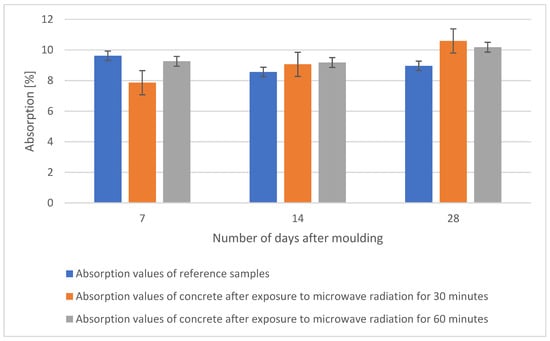 The resulting properties can be seen in Figure 3, Figure 4, Figure 5 and Figure 6. The designation of experiment 1 means that the concrete hardened and cured in a standard way in air and then in the water bath. The designation of experiment 2 means that the concrete was exposed to microwave radiation for 30 min and then immediately demoulded and, after setting to room temperature, was stored in the water bath. Experiment 3 indicates that the concrete was exposed to microwave radiation for 60 min and then immediately demoulded and stored in the water bath after settling to room temperature.