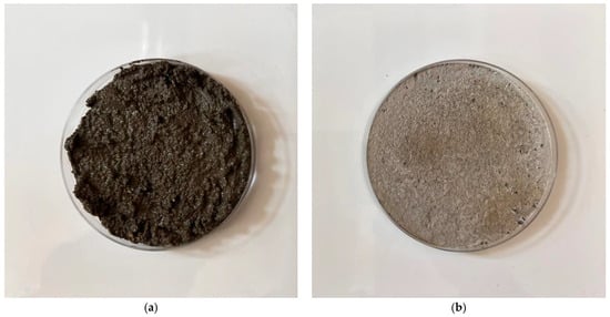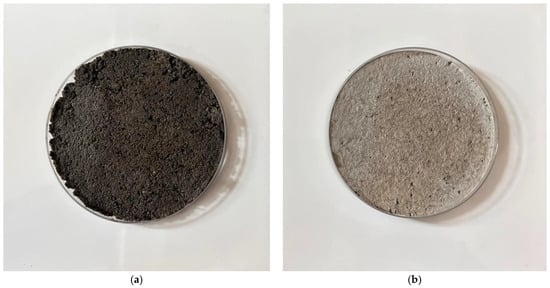 Photographs of samples after 60 min of curing. (a) Photograph of a concrete sample in a circular container that has cured in the standard way after 60 min of curing. (b) Photograph of a concrete sample in a circular container that has been exposed to microwave radiation for 60 min.