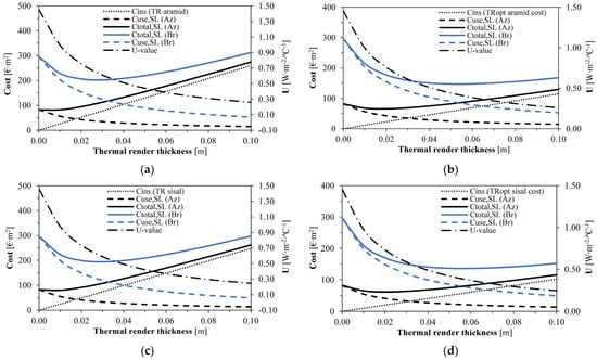 Optimum insulation thickness for the aramid and sisal thermal renders (Az—Azores; and Br—Bragança): (a) Aramid−based thermal render (TR aramid); (b) Aramid−based optimised costs thermal render (TRopt aramid); (c) Sisal−based thermal render (TR sisal); (d) Sisal−based optimised costs thermal render (TRopt sisal).