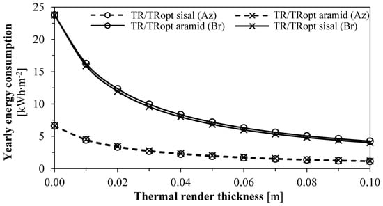In Bragança, the thermal insulation thickness had a higher influence on the energy consumption reduction (Figure 2) due to its thermal conductivity. In this case, the economic optimisation has no direct influence since the thermal conductivities of the economically non-optimised and optimised formulations are the same. For example, the use of 0.01 m of thermal render, either aramid- or sisal-enhanced, can lead to an annual operational energy saving of 7.86 kWh∙m−2 in Bragança and of 2.10 kWh∙m−2 in the Azores due to their similar thermal conductivities.