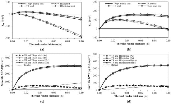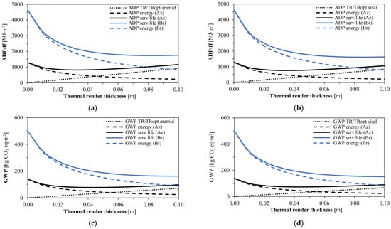 Environmental indicators for the different thicknesses of the aerogel−based fibre−enhanced thermal renders (Az—Azores; and Br—Bragança): (a) Aramid−based thermal renders ADP−ff (TR and TRopt aramid); (b) Sisal−based thermal renders ADP−ff (TR and TRopt sisal); (c) Aramid−based thermal renders GWP (TR and TRopt aramid); (d) Sisal−based thermal renders GWP (TR and TRopt sisal).
