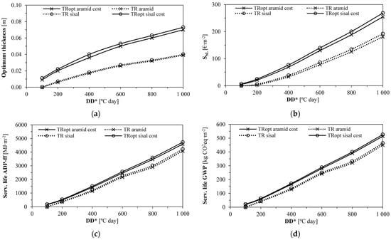 Influence of the DD* on the optimum thickness and respective impacts (economic and environmental): (a) Optimum thickness as a function of DD*; (b) Service life economic savings for the optimum thickness; (c) Service life ADP−ff savings for the optimum thickness; (d) Service life GWP savings for the optimum thickness.