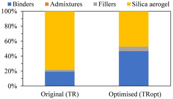 An investigation was carried out to identify which raw materials impacted the TR reference costs the most (Figure 6: Original scenario (TR)). The binders represented ≈19% of the cost per cubic meter, with the silica aerogel representing more than 75% and the admixtures and fillers only ≈3%. Thus, silica aerogel was the raw material with the highest contribution to the renders’ acquisition cost, which is also due to the significant amount used in the formulations (≈70% vol.).