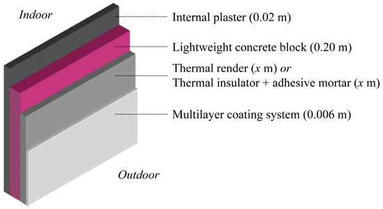 In the wall, the external finishing multilayer coating system, the internal plaster and the lightweight concrete blocks were similar in all simulations, and their thermal transmittance (U) contribution was considered. The multilayer coating system comprises commercially available basecoat, fibreglass mesh, keycoat and acrylic finishing coat, with a total thickness of ≈0.006 m, previously characterised in terms of environmental impacts [].