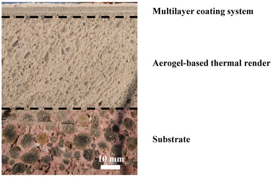 However, some limitations can impair the application of aerogel-based thermal renders on building envelopes, such as their low mechanical strength [] and high capillary water absorption [,,]. Two main effective methods have been followed to overcome such limitations: the introduction of fibres [,,] and the application of a multilayered protective coating system on the renders’ surface, which is composed of a basecoat, a fibreglass mesh, a key coat and a finishing coat [], similar to the ones applied over ETICS (external thermal insulation composite systems) []. Hygrothermal [] and environmental [] characterisations verified that aerogel-based fibre-enhanced thermal renders show multifunctionality.