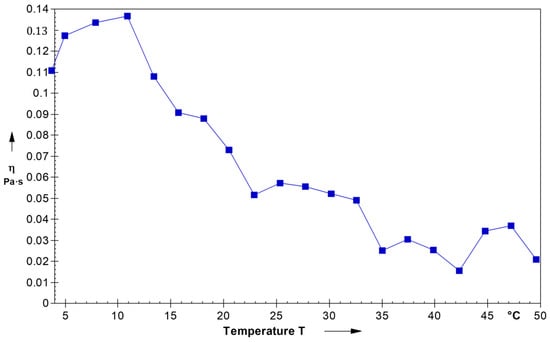 The swelling capacity and formation of a three-dimensional gel-type network of mucilage and other polysaccharides during the gelation process is a parameter that involves a transition from a liquid (sol) state to a gel state in the presence of heat. This transition is marked by significant changes in viscoelastic properties and the development of solid-like characteristics. Herein, the viscosity effect of temperature on the TMCG solution is shown in Figure 2 for the shear rate 0.14 s−1. The TMCG solution showed pseudo-plastic behavior or shear-thinning fluid behavior because the result showed a decrease in viscosity with the increasing shear rate. Moreover, the rheological (viscoelastic) properties of the gelling system are often evaluated to regulate its suitability for commercial applications. Determining the rheological behavior is a key approach to estimating the stability of gels produced through the addition of gums. This is because interactions between different polymers can influence and modify the rheological profile of the gel. Understanding these rheological changes is essential for assessing the efficacy and performance of the gel for its intended commercial uses [11].