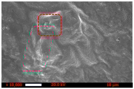 The prepared TMCG was analyzed by the SEM at 10,000 magnification to evaluate its surface morphology. TMCG were found to be uniform in shape, spongy, porous, and spherical structure, as shown in Figure 4. The porosity of TMCG helps for the entry and release of the water. Several pores were present on the surface, which was attributed to the presence of the hydrophilic nature of TM. Imaging of the gel surface was observed to rapidly induce ablation of the gel water content. These findings are well supported by a study conducted by Thakur et al. [17] who developed the gum Arabic/guar gum-based biopolymeric nano hydrogel for the enhancement of the shelf life of the grapes and dye reduction. In their study, SEM results revealed that irregular and asymmetrical shapes were observed for the embedded nano hydrogel with the metal oxide nanoparticles. Furthermore, similar morphological features (smooth and even surface) were found for the control (gum Arabic/guar gum-based nano hydrogel. The incorporation of nanomaterial (metal oxide nanoparticles) into the nano hydrogel showed the presence of radiance polygonal and tiny shapes.