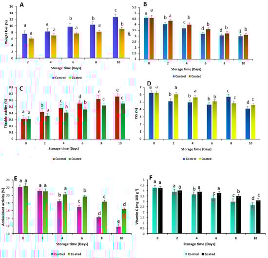 Physicochemical properties of coated and uncoated brinjals: (A) weight loss, (B) pH, (C) titrable acidity, (D) TSS, (E) antioxidant activity, (F) vitamin C (the error bars represent the means with standard error of the two replicate samples, and various lowercase letters show the significant difference (p ≤ 0.05) between coating treatments).