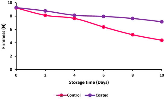 The total vitamin C content of the coated and uncoated brinjals was 4.25 ± 0.27% on the 0th day, which significantly decreased up to 2.64 ± 0.69% for the control and 3.11 ± 0.73% for coated brinjals. In this perspective, it has been believed that higher-ascorbic-content-containing foods can help to maintain cartilage, bones, blood vessels, and healthy skin. A similar observation was found in a study performed by Singh et al. [21]. The vitamin C content of coated samples was retained as compared with the control sample. The firmness of the control and coated brinjals is shown in Figure 6. The firmness of the control cut brinjals and coated brinjals was found to be 9.22 ± 0.15 N and 9.26 ± 0.37 N on the 0th day, which significantly decreased up to 3.38 ± 0.71 N and 7.15 ± 0.34 N, respectively. Firmness is a crucial factor in determining the time to harvest, the maturity of the fruit or vegetable, and the quality level of the fruit or vegetable. Brinjal firmness measurement is a lengthy and challenging task. This is certainly applicable to fruits whose hue has no significant connection regardless of the hardness of the brinjals [22]. Likewise, a minimum decrease (8.56 N–6.92 N and 8.56 N–5.63 N) in firmness was recorded in polyethylene glycol and 0.5% sodium alginate in diluted (1:4) carnauba wax emulsion (T2), while the maximum decrease (8.56 N–5.54 N and 8.56 N–3.57 N) was recorded in the control (T4) packaged and unpackaged eggplants after 12 days of storage, respectively [21].