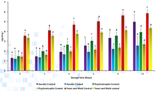 On the other hand, yeast and mold counts for the control samples were 3.57 ± 0.38 log CFU g−1 on the 0th day and 3.34 ± 0.68 log CFU g−1 for edible coated brinjals on the 0th day, whereas, on the 10th day, yeast and mold growth significantly increased up to 5.87 ± 0.88 log CFU g−1 for the control and 4.35 ± 0.75 log CFU g−1 for the coated brinjals, respectively. TM is a good source of uronic acid. These uronic acids have great efficacy against various food pathogenic microorganisms. Also, the gelling property of mucilage prevents the food from physical, chemical, and biological hazards, resulting in the enhancement of the shelf life of brinjals [15]. TM can inhibit the bacterial adhesion to the host tissues and cells by preventing the bacteria from adhering to surfaces; they hinder the initial steps of bacterial colonization and infection. Moreover, TM can interact with the bacterial cell membranes; they disturb the integrity of the bacterial cell membrane by binding to lipopolysaccharides or peptidoglycans, leading to the leakage of cellular contents and ultimately cell lysis. Overall, TM has antibacterial properties that can be attributed to its ability to increase cell membrane permeability, prevent pathogenic bacteria from adhering to host cells, or hinder the transmembrane movement of nutrients or energy molecules [23,24,25,26,27].