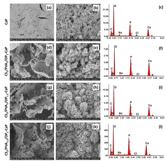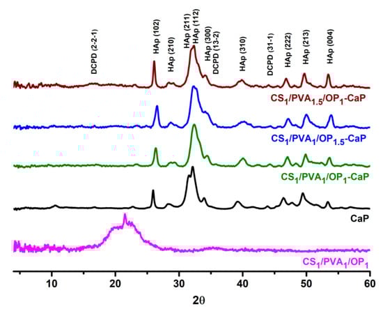 | Hydrogel | CaP | CS1/PVA1/OP1-CaP | CS1/PVA1/OP1.5-CaP | CS1/PVA1.5/OP1-CaP | ||||