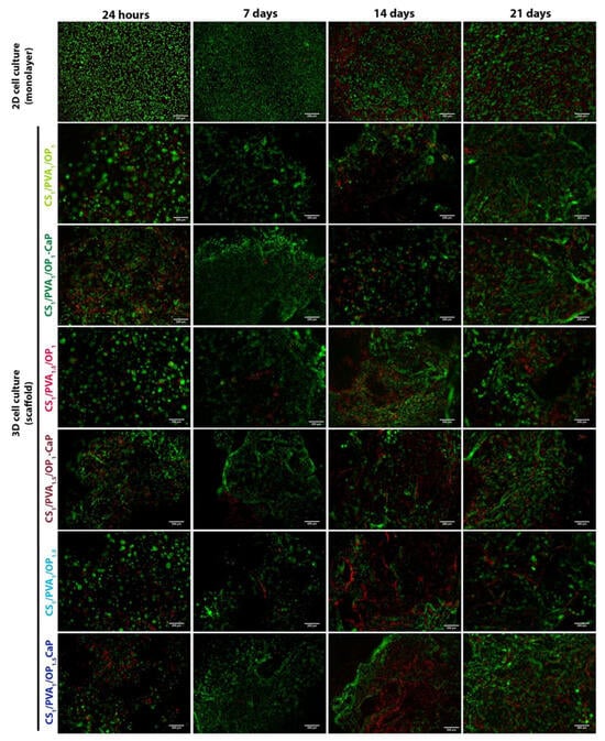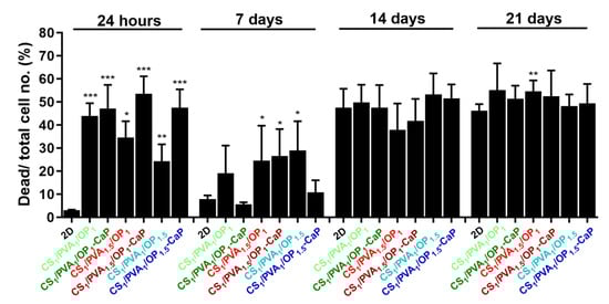 | CS1/PVA1/OP1.5-CaP | 1.77 ± 0.09 | 62.6 | 89:11 | 101.8 ± 4.2 | 64.3 ± 2.5 |
