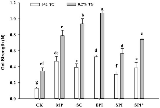 Effect of TGase on the gel strength of different non-meat protein emulsion composite gels. Note: CK: a pure MP gel without the addition of emulsion. MP: composite gel (2% protein and 10% oil) with MP emulsion (1% MP and 20% oil) added to MP suspension. SC: composite gel (2% protein and 10% oil) with SC emulsion (1% SC and 20% oil) added to MP suspension. EPI: composite gel (2% protein and 10% oil) with EPI emulsion (1% EPI and 20% oil) added to MP suspension. SPI: composite gel (2% protein and 10% oil) with SPI emulsion (1% SPI and 20% oil) added to MP suspension. SPI* Indicates pre-heating SPI. Values of different groups with different lowercase letters (a–g) are significantly different at p < 0.05. Error bars were standard errors of the mean (n = 3).
