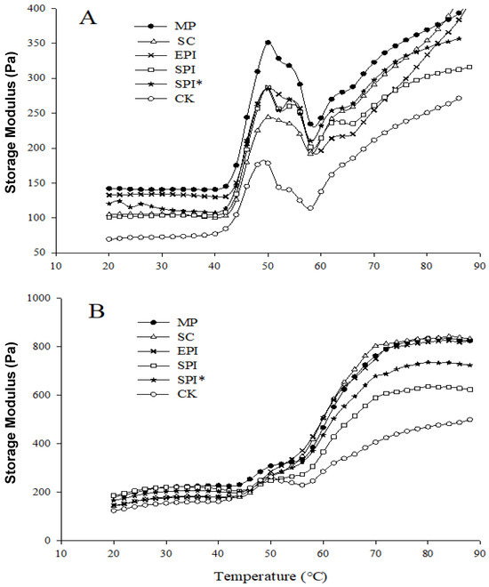 (A) Effect of 0% TGase on storage modulus of composite gels; (B) Effect of 0.2% TGase on storage modulus of composite gels. Note: CK: a pure MP gel without the addition of emulsion. MP: composite gel (2% protein and 10% oil) with MP emulsion (1% MP and 20% oil) added to MP suspension. SC: composite gel (2% protein and 10% oil) with SC emulsion (1% SC and 20% oil) added to MP suspension. EPI: composite gel (2% protein and 10% oil) with EPI emulsion (1% EPI and 20% oil) added to MP suspension. SPI: composite gel (2% protein and 10% oil) with SPI emulsion (1% SPI and 20% oil) added to MP suspension. SPI* Indicates pre-heating SPI.