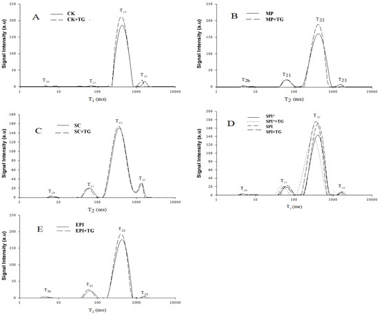 Changes in distributions of T2 relaxation times of myofibrillar composited gels treated by TGase. Notes: (A): T2 relaxation time changes of CK, CK + TG; (B): T2 relaxation time changes of MP, MP + TG; (C): T2 relaxation times of SC, SC + TG; (D): T2 relaxation time changes of SPI* + TG, SPI*, SPI and SPI + TG; (E): EPI, T2 relaxation time of EPI + TG; * Indicates pre-heating of SPI.