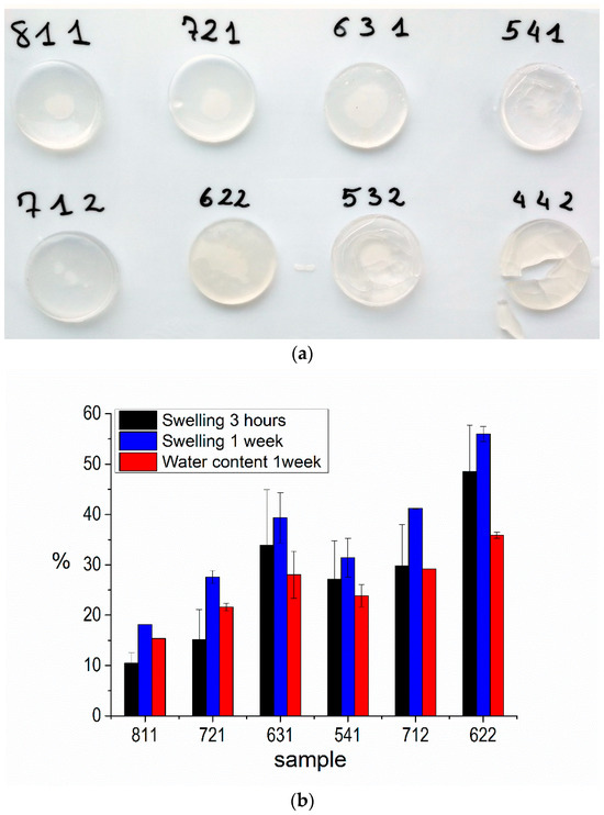 PEG-based materials possess the ability to absorb and retain large amounts of water, which consequently should be considered as an essential component. For this reason, all the specimens were first tested to evaluate the water uptake and swelling behavior in order to assess the range of nominal compositions of the materials approaching the desired performances [17,42]. Figure 1 shows the appearance of the samples after 1 week of swelling, and the water content and swelling ratio, which were calculated by Equations (2) and (3) respectively (Section 4.3). From Figure 1a, it is clear that some compositions should be discarded due to unavoidable fragility, such as those with lower tBA content (532 and 442), which resulted in cracking after a few days of soaking. Due to the mass loss and inability to maintain the shape, some analytical results on these samples are not discussed further on.