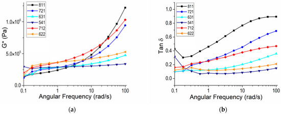 Allowing the networks to reach their swelling equilibrium, after 1 week of soaking, results in a general slight increase in G* (data not shown). G* increases more for the samples with higher tBA content, such as 811 or 712. The tan δ values follow the same trend, with higher values for the samples with higher tBA content, even if to a lower extent when compared to the corresponding values measured after 3 h of soaking.