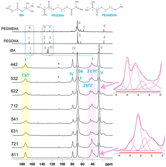 All the produced functional groups give rise to the resonance around 40 ppm, resulting in an overlapped band, whose fitting is proposed in the insets of Figure 4. A profile-fitting analysis is useful not only for the identification of the resonances but also for calculating the degree of branching (DB%) of the materials, which indicates the presence of both side-chain and crosslinking points and highlights the polymeric chain organization. According to the literature [48,50], the DB% and the associated error can be calculated by Equations (S1) and (S2) from the area of the new signals belonging to polymerized tBA, as explained in detail in the Supplementary Materials (Figure S4 and Table S2).