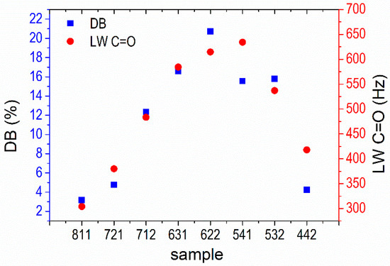Linewidth (LW) of the C=O resonance and DB% (calculated from Equation (S1) in Supplementary Materials) as a function of samples composition.