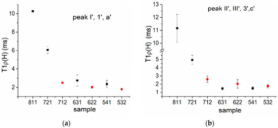Trends of the extrapolated T1ρ(H) of the 13C VCT NMR magnetization curves for the main resonances C=O, i.e., peak I′,1′,a′ (a), and CH-CH2, i.e., peak II′,III′,3′,c′ (b), of all the samples. Black spots refer to the series with 10%wt of PEGMEMA, whereas the red spots refer to the series with 20%wt of PEGMEMA.