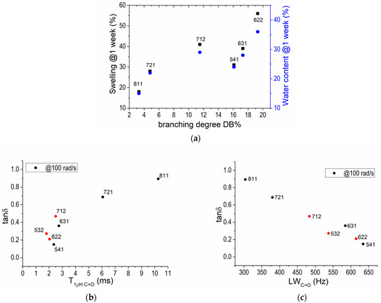 Trends of both swelling ability and water uptake with respect to the DB% (a), tan δ at 100 rad/s vs. the carbonyl LW (b) and vs. the spin–lattice relaxation time (c). In (b,c), black spots refer to the series with 10%wt of PEGMEMA, whereas the red spots refer to the series with 20%wt of PEGMEMA.