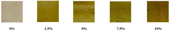 These results determined the transparency value of the film, where the transparency value was directly proportional to the film’s transmittance. The transparency values are presented in Table 1. Increasing the concentration of FLE significantly affected the transparency of the film samples. Higher transparency values correspond to a higher visible light absorbance, which indicates a lower transparency of the film [23,24,25,26,27,28,29,30,31,32,33]. Therefore, the edible film with 10% FLE had the best UV barrier but had the lowest transparency.