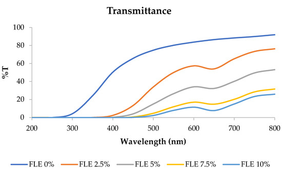 Transmittance refers to the ability of an edible film to allow the passage of light or other electromagnetic radiation through it. Films with high transmittance are more transparent, allowing more light to pass through, while those with low transmittance are less transparent or even opaque [7]. The transmittance of fish gelatin edible films incorporated with FLE at 200–800 nm wavelength is shown in Figure 2. The percentage of light that could pass through the edible film decreased as the concentration of FLE increased.