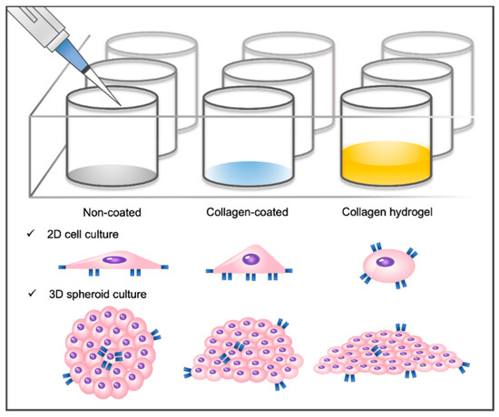 Schematic of the cell culture environment. Three different substrate types are shown: non-coated cell culture plate, collagen-coated cell culture plate, and collagen hydrogel substrate. Two-dimensional monolayer cells and three-dimensional spheroids have been cultured on these substrates.
