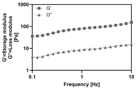 To evaluate the properties of the collagen hydrogel, the storage modulus (G′) and loss modulus (G″) were measured using a rheometer (Figure 2). Frequency sweep rheology determines the relationship between G′ and G″ of a material at different frequencies, providing a rheological method to analyze viscoelastic properties and material state [13]. Throughout the frequency range, G′ showed higher values than G″, indicating that the collagen hydrogel exhibited the behavior of gel.