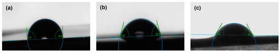 Contact angle analysis of substrates. (a) Non-coated, (b) collagen-coated, and (c) collagen hydrogel substrates. Images of water droplets on the surface.