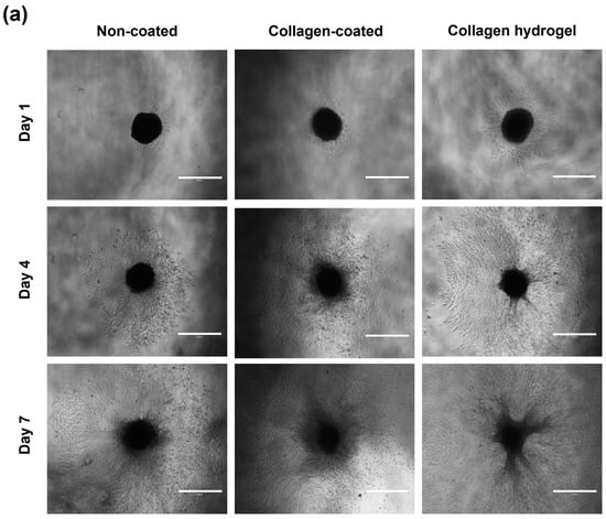 A round bottom plate was coated with a coating solution and 2 × 103 NIH3T3 cells were seeded to form 3D spheroids. The size of the resulting spheroids and their migration over time were measured (Figure 5). The initial diameter of the spheroids was 510 ± 44 μm. After the spheroids were transferred to each substrate, the average diameter and area of the spheroids were measured on days 1, 4, and 7. The average diameters and areas for spheroid migration on the non-coated, collagen-coated, and collagen hydrogel substrates on days 1, 4, and 7 are shown in Table 1.