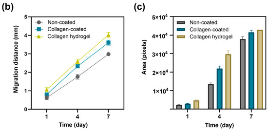 The surfaces of collagen-coated and collagen hydrogel substrates provide abundant cell–collagen interactions, suggesting that cell migration may be more active compared to the non-coated substrate. Collagen is a major protein component of the extracellular matrix (ECM) and plays a critical role in cell attachment and proliferation by regulating cytoskeletal rearrangement and signal transduction [17]. In contrast, cells on the non-coated substrate were confined to a smaller area over time, reflecting slower cell migration due to reduced cell–matrix interaction on an untreated surface.